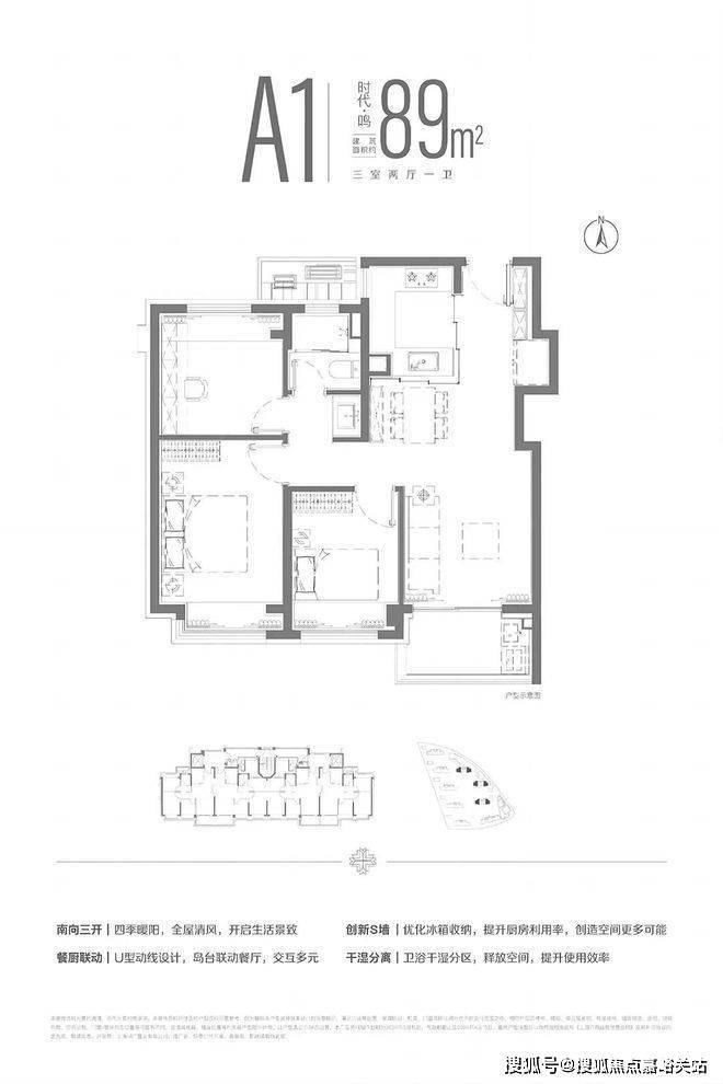 建面约89平的三房两厅一卫,400万级别主打低总价,三开间朝南,通过S墙的设计解决了冰箱空间问题。招商时代乐章售楼处电话:4008569058 ☑️☑️