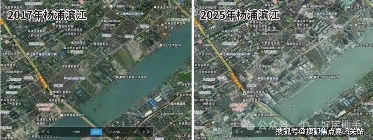 作为黄浦江畔的压轴板块,杨浦滨江的建设速度是有目共睹的,下图是2017-2025-2026年杨浦滨江的卫星影像变化图,几乎是一年一个样!