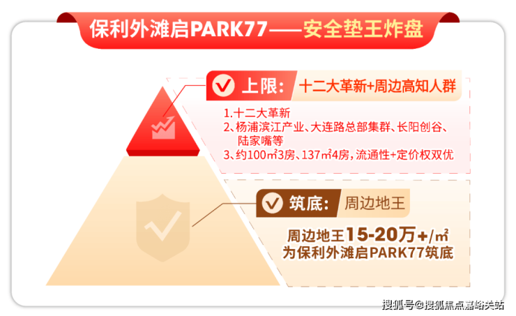 再看项目价值底盘:周边地王售价预期15-20万+/㎡ , 为项目价值筑下坚实“安全底”; 同时,项目自身 “12大颠覆革新”产品力, 叠加周边杨浦滨江科创产业、长阳创谷、大连路总部集群、陆家嘴金融产业的产业赋能,以及高校环绕的高知氛围,共同为项目打开了价值上限,“安全底+高上限”的组合,让资产安全性更有底气。