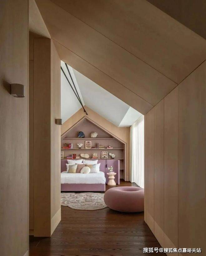 四层阁楼是大女儿的卧室。这里的斜顶启发我们在空间内打造了一个木质小屋;配备私人浴室和衣帽间,还有一个露天阳台,仿佛这充满阳光的一层就是个独立公寓。