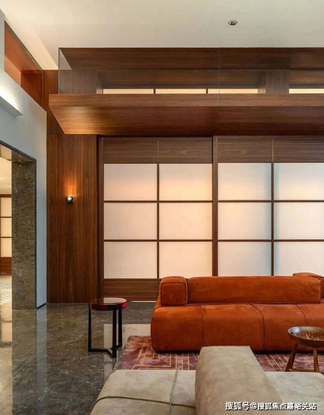 在客厅中,两个展示架巧妙地将空间分隔成主客厅区和休闲室,营造出一个与建筑尺度交相辉映的层次空间。