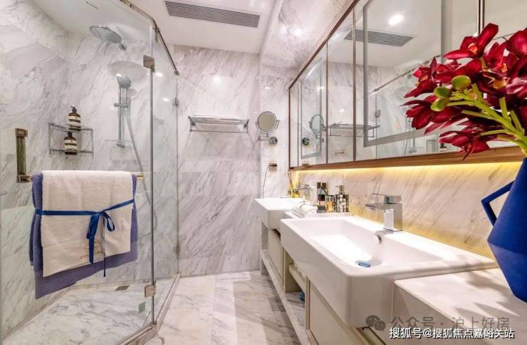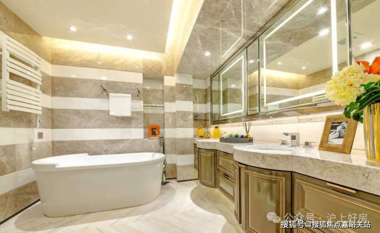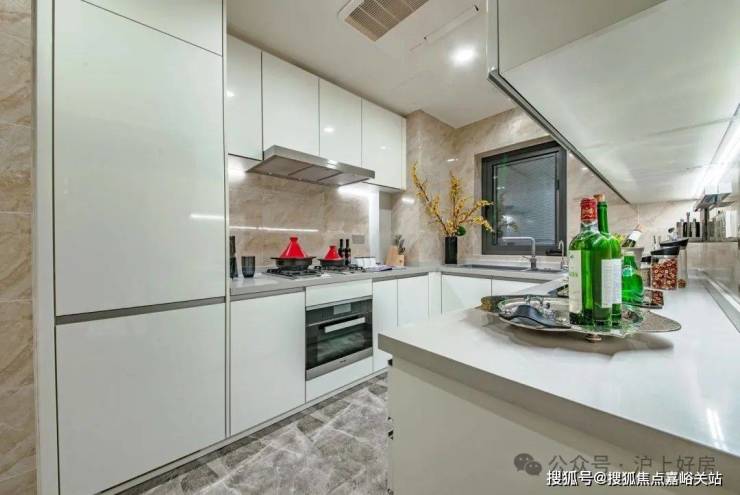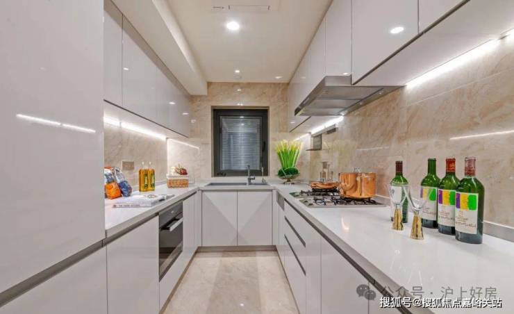 厨房就配置了铂浪高的水槽及龙头、柏丽橱柜及爱适易垃圾处理器、怡口户式中央净软水;卫浴系统选用了德立菲的卫浴、高仪龙头、卡迪欧电热毛巾架,皆为国际尖端品牌。