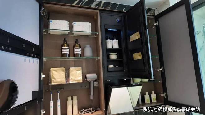 主卧套房,主卫镜柜内置牙刷消毒器、吹风机架,美妆冰箱,这些现在基本都是标配了,不过项目在美妆冰箱下方还做了个口红收纳格。