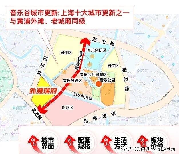 旁边还有上海首批十大城市更新单元——虹口嘉兴01单元。这个单元是内环少有的“完整水系风貌更新区”,未来将依托虹口港打造“一湾两半岛”,定位 “东方百老汇” :滨水步行道连贯成片,百年石库门里弄变身爵士乐演出场地与独立艺术画廊,滨水市集的霓虹与水岸光影交织,形成“生活为体,音乐为魂”的海派艺文场景。这种 “历史+生态+艺文”的高级烟火气, 是传统豪宅区没有的,住这儿不是“看风景”,而是把生活过成“未来艺术化剧场”。