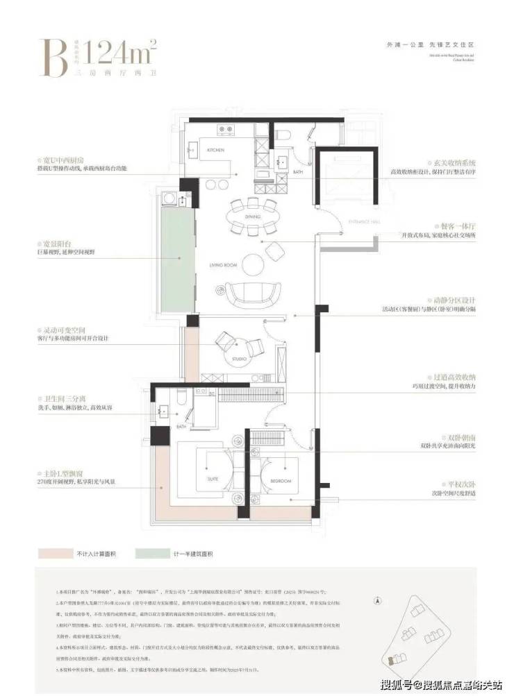 建面约124㎡的边厅“全景舱”户型,是外滩板块极致稀缺的臻品。它以三房布局满足主流家庭需求,更以无遮挡的视野与巨幕般的边厅落地窗,将城市天际线化为私藏画卷。主卧270°L型飘窗,让阳光与风景成为生活的主角。