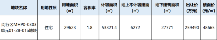 闵行区MHP0-0303单元01-28-01a地块,为保利置业于今年11月27日七批次土拍中竞得的地块。