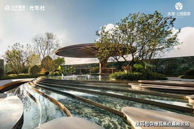 首先,大华公园柏翠利用12级叠水、2座树池、9步水上汀步,运用六重造景的手法打造近500平的中央水景!