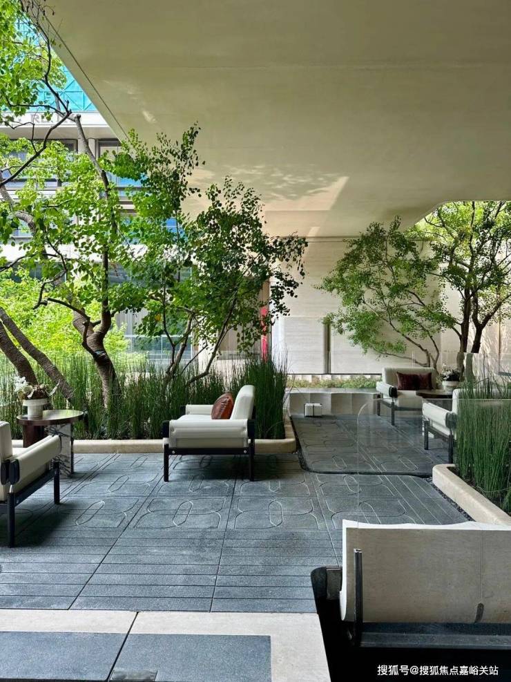 由风雨连廊串起游园式的步行回家路线,搭配景观绿植、水景设计,散落几处户外悬浮客厅~