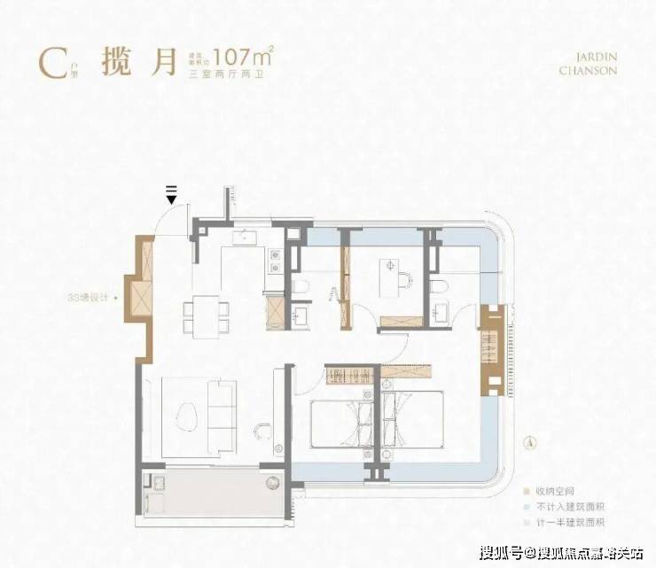 建面约107㎡的3房,客厅的面宽被拉长到了约4.7米;3S墙的设计,扩容了家的储物角落;主卧、主卫双270°全景飘窗的设计。