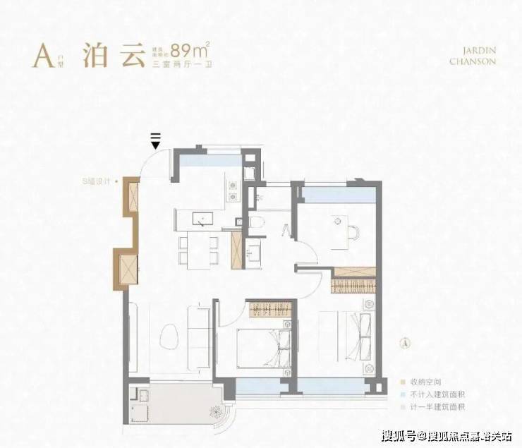 建面约89㎡3房户型,利用科学的收纳和S墙设计保障了室内空间的井井有条,又通过大量飘窗和阳台等提升尺度感,厨房也附带飘窗。