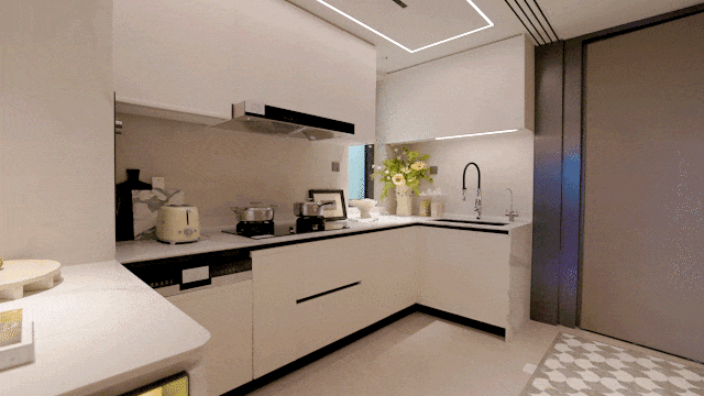 厨房墙面岩板通铺,开门采用水波纹玻璃+金属造型边框的玻璃移门,顶部配置线性凉霸+LED嵌入式回形。灯带+筒灯,细节考量全方位。