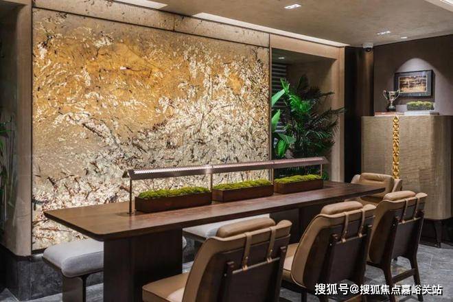 精致的迎宾水景、苍劲滴翠的罗汉松,为城市的界面,增添一抹亮色,也让当代年轻人,在享受现代都市生活的同时,感受到家的温暖和亲切。蓝翡翠的奢石,以深邃幽远的尊蓝色基底,尽显光彩下的神秘奢华;而顶部异形的仿铜星空顶设计,用香槟金色斜角造型铝板搭配熠熠灯光,碰撞出科技与艺术的美学。
