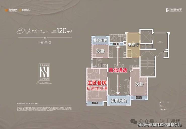 项目建面约120㎡户型也是 类独立电梯厅的设计,室内则是标准的 南北通透+三开间朝南设计;主卧套房配置,自带卫生间,私密性和舒适度俱佳。