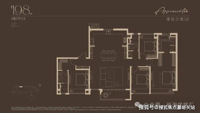 建面约198㎡4房户型,上海南山璞缦官方售楼处电话:400-118-5086√√√【已认证】嘉定“收藏级”传世大宅!塔尖人士的挚爱之选!2梯2户的设计,子母双开门礼序入户,私密尊崇门厅,彰显尊崇生活仪式感。