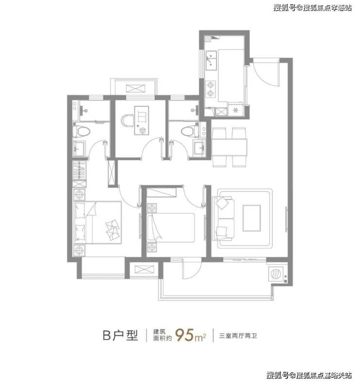 建面约85㎡的3房2厅1卫,三开间朝南+整体动静分离的设计,都保证了这个户型的居住舒适度。整个户型全明设计,户型方正,南北通透,卫生间干湿分离,光明对于产品细节的把控力可见一斑。