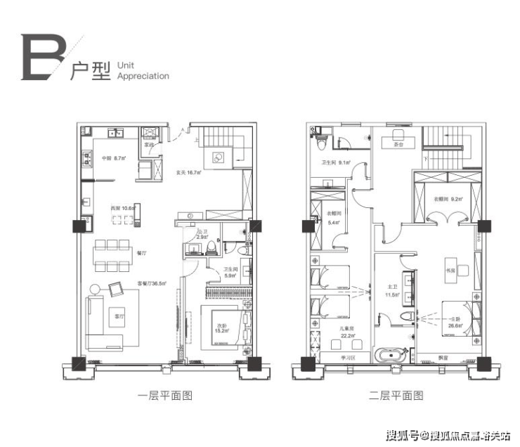 B户型:客餐厅一体,主卧带书房,中西厨,大衣帽间