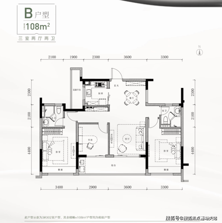 108方中间套,三个房间及客厅全部南向的设计,开间面宽超过了13米。