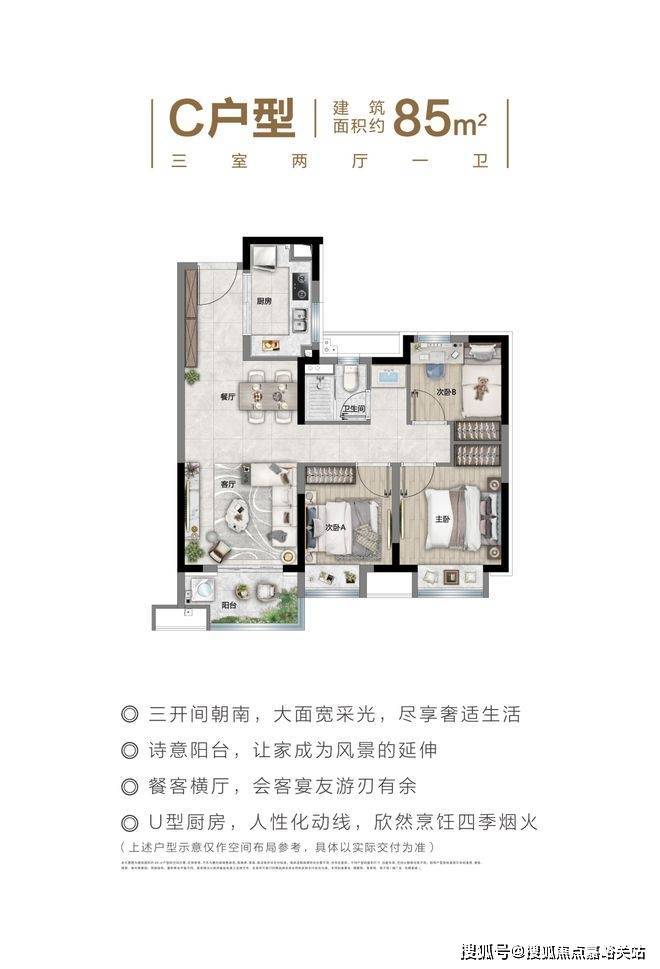 面积段:约75㎡/108套,约85㎡/144套,约95㎡/105套,约115㎡/36套