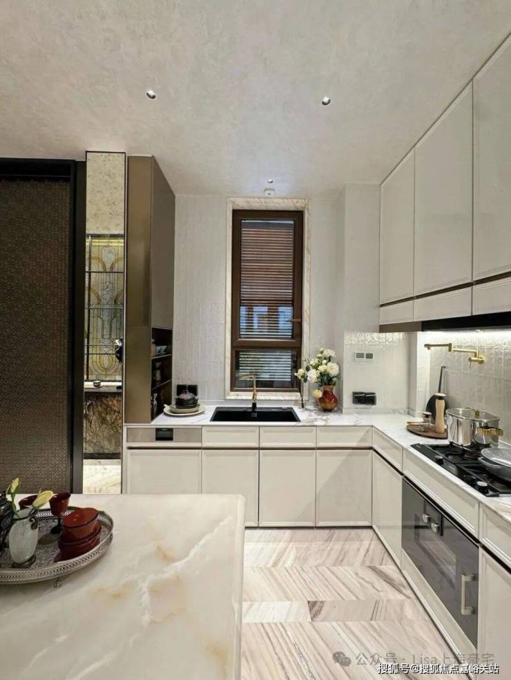Prada绿奢石镶嵌于门厅与水景,地面铺装与建筑立面相呼应,菱形地花+海棠纹镶钻拼花,入户铺贴范思哲黑奢石。