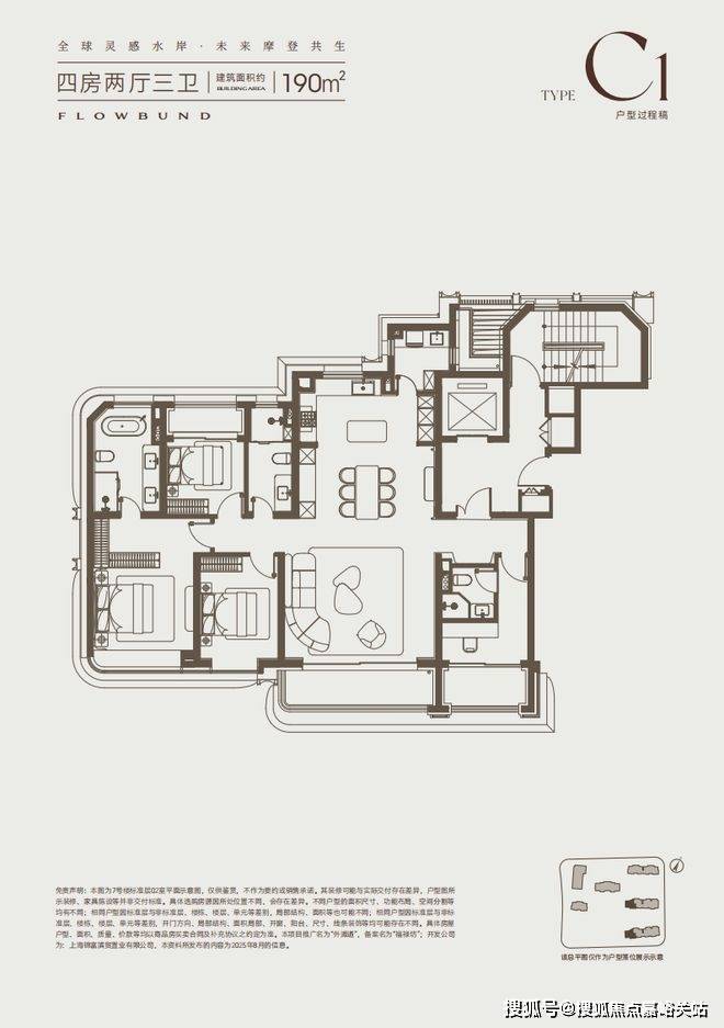 建面约190㎡四房,约3.15米的层高,塑造出极具立体感的纵向空间;