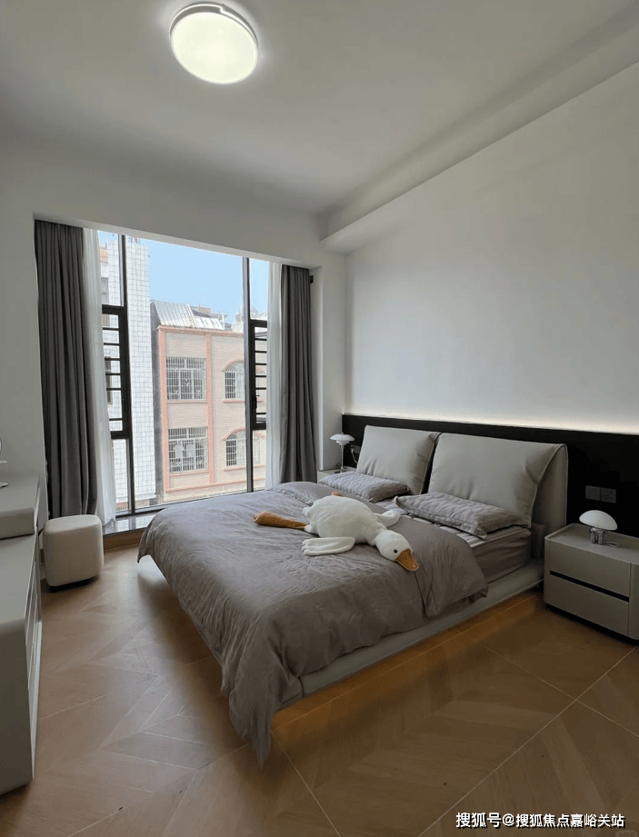 而主人房则是铺了木纹砖,氛围更温馨,其他房间由于暂时没人居住,因此只铺贴了浅灰色地砖。