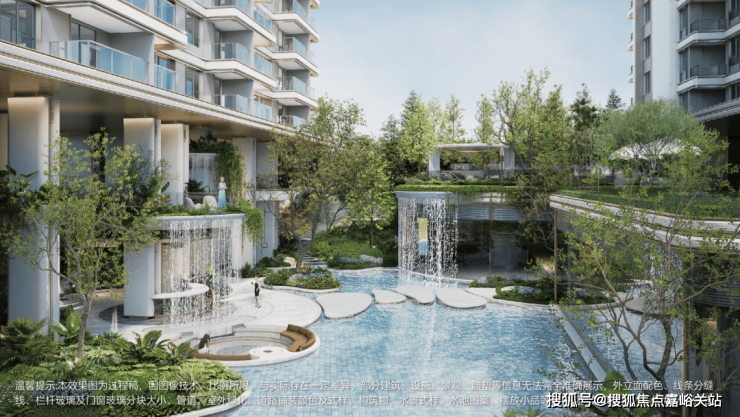 摒弃常规项目的平面化绿化,西派云间以“折叠手法” 打造立体叠瀑森屿。约10米高差的坡地之上,水流从云端倾泻而下,形成层次分明的叠瀑景观;