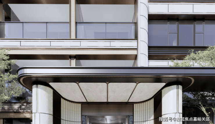 在楼栋主入口同样运用石材+弧形铝板等元素,同时还有格栅装饰,质感提升明显: