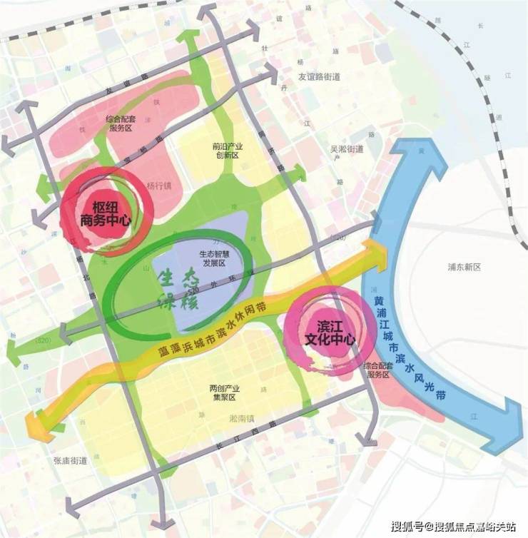 “五区”:杨行枢纽商务中心、滨水中心、宝武特钢地区转型的生产性服务业集聚区、宝武不锈钢转型的科技化创新区、蕰藻浜北岸预留生态智慧发展区则构成“五区”。