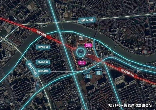 基地制约条件较多,地铁1号线从场地正中穿过,2#、3#、4#住宅楼均位于地铁盾构安全保护区内(距盾构16-30米);沿苏州河需按高宽比1:1退界;高层住宅自身南北间距需不小于南侧建筑高度的0.5倍;且需满足冬至日满窗日照1小时的要求。面对多重限制,设计以“一叶四星”布局巧妙应对,三栋44-49层超高层与一栋16层高层住宅高低有序、错落排布,充分利用沿街临河优势,沿苏州河方向呈阶梯状递退,使各住宅单元获得差异化的景观朝向。