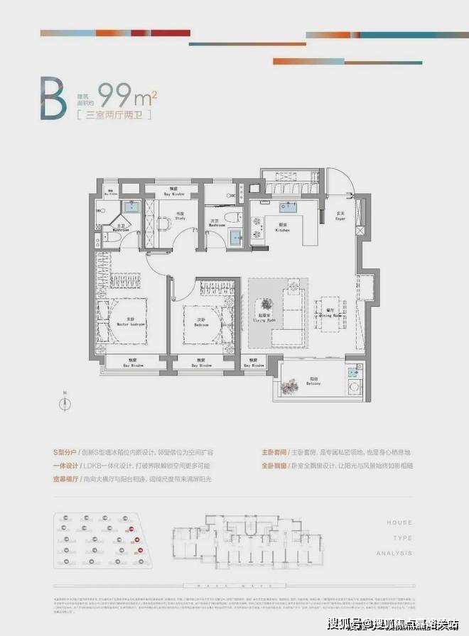 建面约99㎡三房:该户型是典型的飞机格局,很大程度上提高了使用率