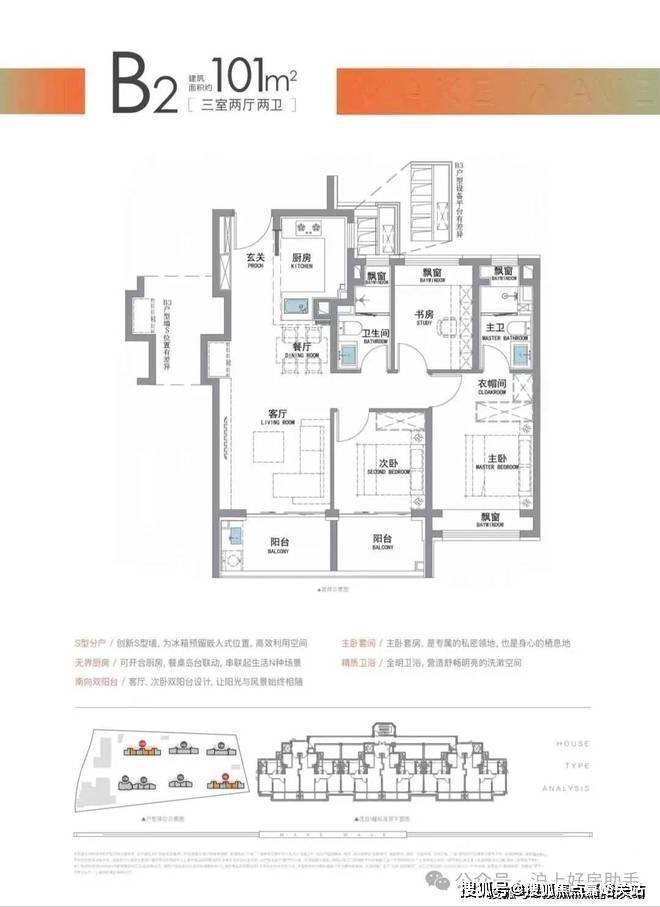 建面约89㎡3房户型:东边套主卧配置约270°双向采光飘窗、S墙设计,主力总价仅约450万级,首付约90万起!