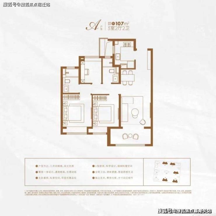 建面约107㎡三房的户型,三开间朝南,大面宽阳台,餐客厅一体,还有精细化收纳体系,人性化细节设计,极具功能性与舒适性,满足高阶精致生活。