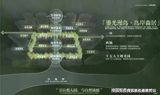 以“山水聚场”理念,规划“一环两轴十五园”景观布局,将水岸、岛屿、森林、花园、树屋作为园林节点,形成“行在景中、坐在岛中、游在林中、意在境中”的美学表达,营造出沉浸式山水活力场域.