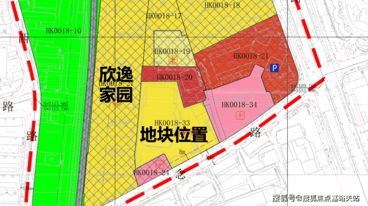 地块位于纪念路北侧,靠近逸仙高架路;地块形状不算规整,东侧紧邻HK0018-34地块,规划为社区医疗卫生用地;西侧是保留的现有住宅,欣逸家园。