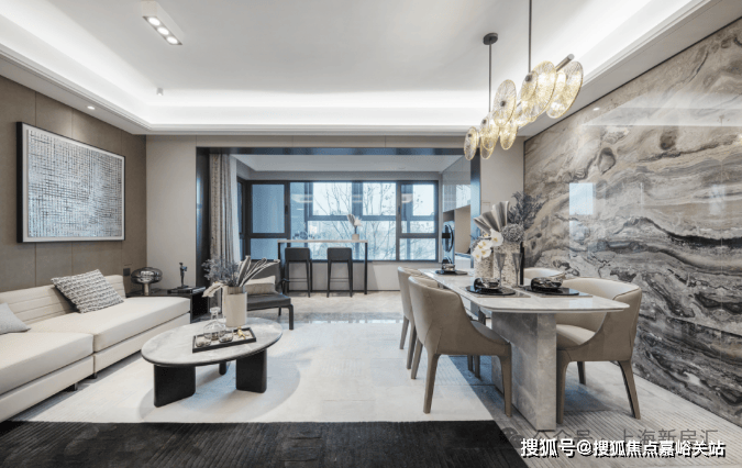 105平三房两厅两卫,在设计中淡化空间的边缘,让客餐厅和阳台一脉相连,居住感又进一步扩大了,最大程度带来阳光,和新鲜空气。约5.1米的宽厅,无论是日常休息还是会客都显得大方得体。