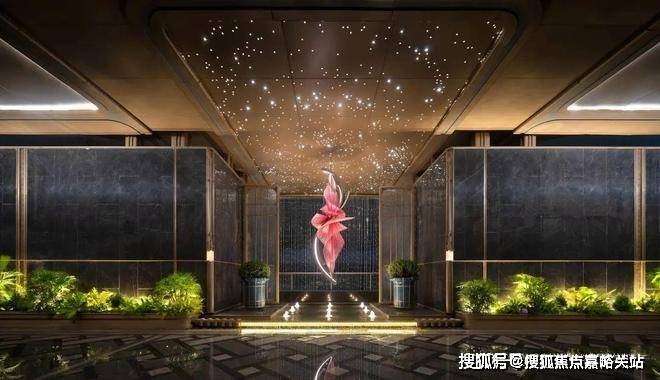 下沉式环幕庭院,跌水景观环绕,池底仿黑金砂与宝石晶片闪烁,点缀百余灯珠,师法“琉璃水光”形意,糅合视听五感,打造全浸式立体园境,天工巧夺,嘉定未见。