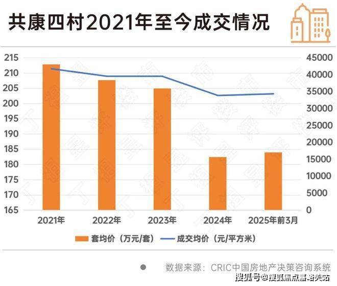 CRIC数据显示,2021年至今共康四村成交均价从41782元/平方米跌至34386元/平方米,跌幅达17.7%,套均总价从212.89万元/套跌至184.04万元/套。