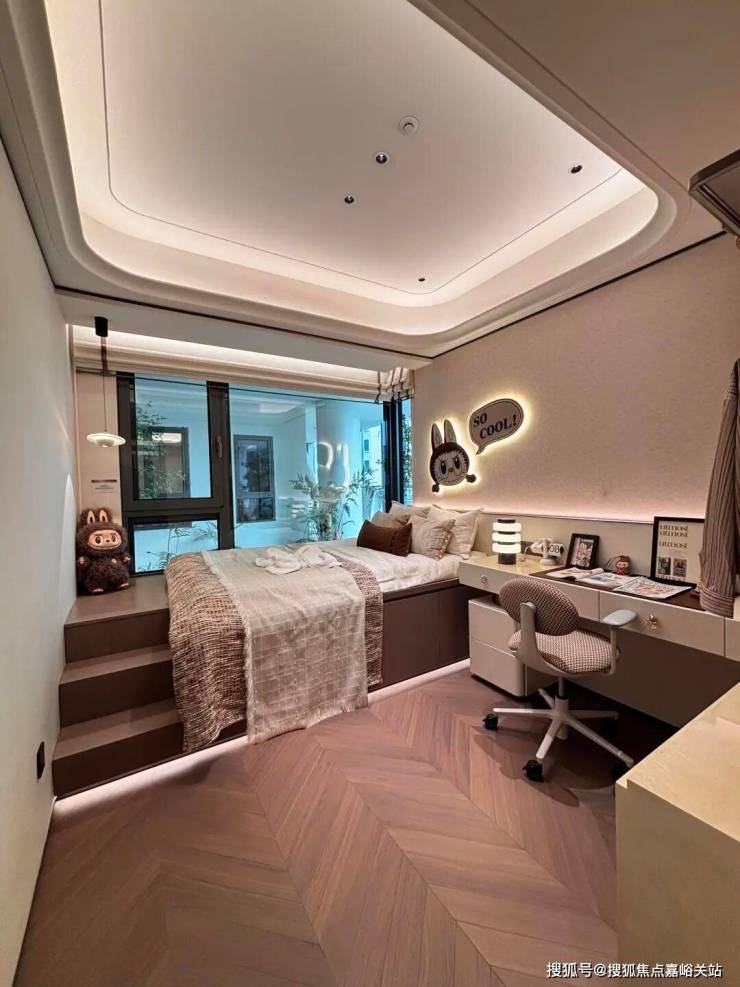 卧室则铺设海派鱼骨拼花地板,借木质肌理的温润与细腻,营造出私密领域的宁静氛围!这种“公区显质感、私域藏温度”的材质分区逻辑,恰是高端住宅设计中至关重要的一笔!
