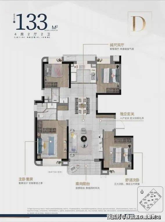建筑面积约133㎡/143㎡四房两厅两卫,大开间,在满足空间感的基础上,增加户型的功能性,承载生活高舒适度;其中建筑面积约133㎡的四叶草户型,主卧套房设计,三代同堂各有私密天地;南向观景阳台,饱览阳光美景,双卫设计,提供更多私密空间与生活便利。
