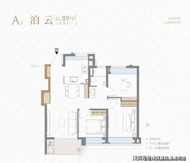 建面约89㎡3房户型,利用科学的收纳和S墙设计保障了室内空间的井井有条,又通过大量飘窗和阳台等提升尺度感,厨房也附带飘窗。
