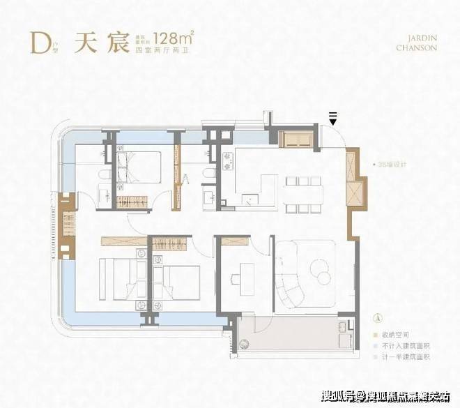 建面约128㎡4房延续3S墙和双270°全景双舱亮点的同时,尺度感极大提升,南向四开间,保证了更充沛的采光和视野。客餐厅+超大尺度阳台贯穿南北,进门视野无遮挡。