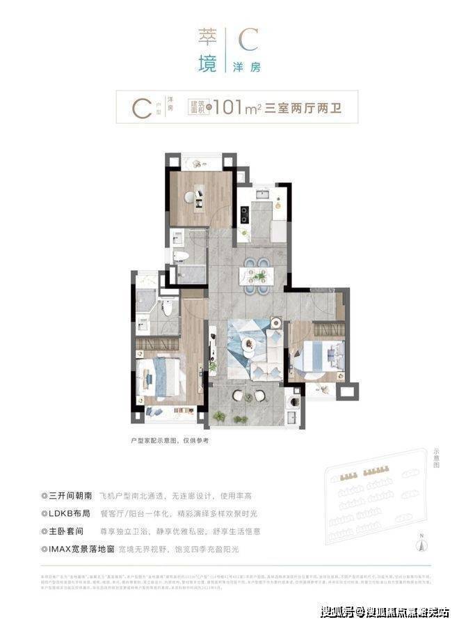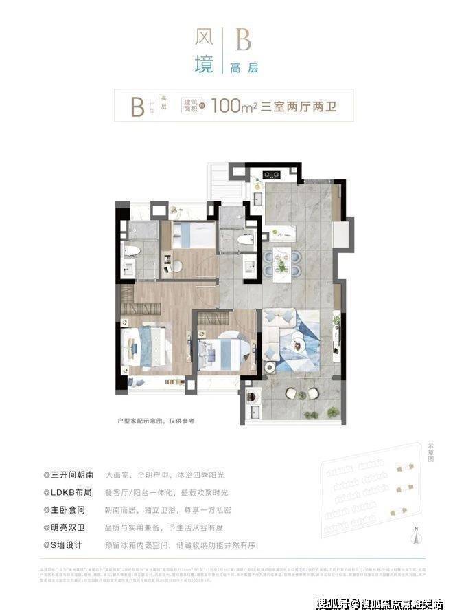 建面约100㎡3房:三开间朝南+南北通透+双卫设计,充分满足刚需置业两代人的生活需求!LDKB一体化设计,为家庭交互提供全新场景,将空间更大化利用!