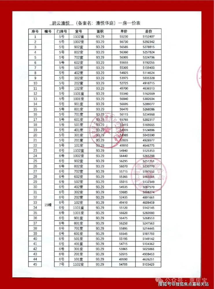 一房一价表如下
