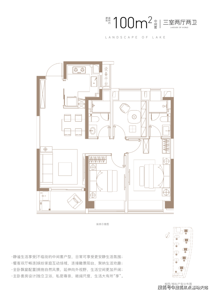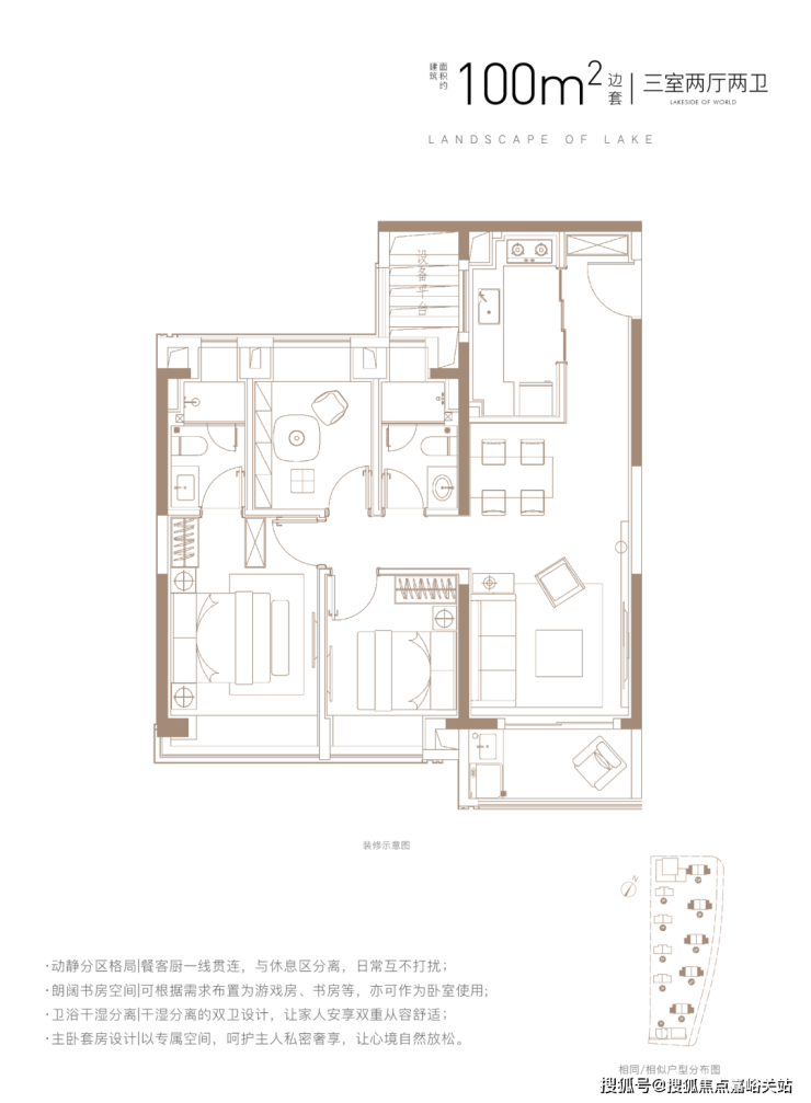 建面约100㎡3房2厅2卫,做到了 三开间朝南+主卧套房设计+动静分离+全卧室带飘窗,功能性和尺度感完美结合的3房户型。