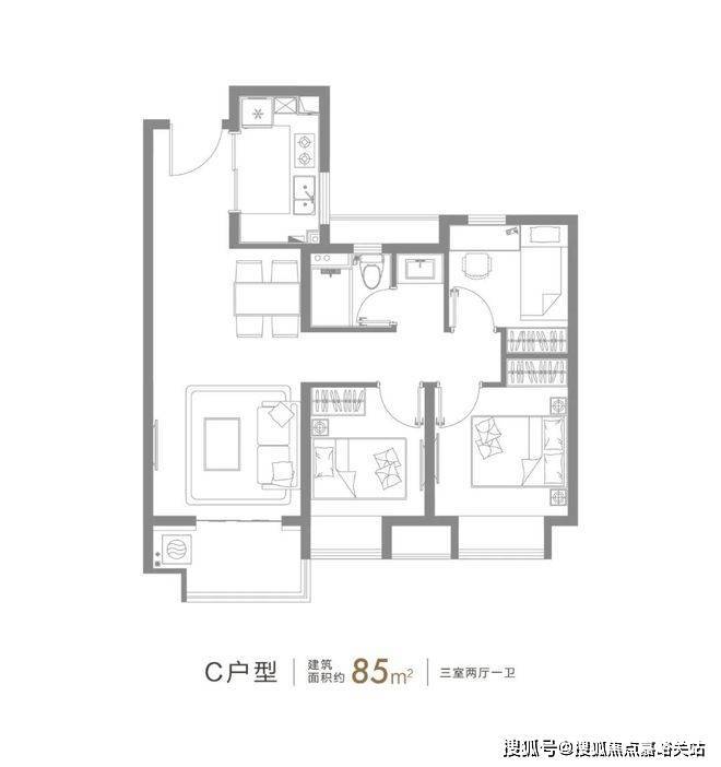 约85㎡的3房2厅1卫,三开间朝南+整体动静分离的设计,都保证了这个户型的居住舒适度。