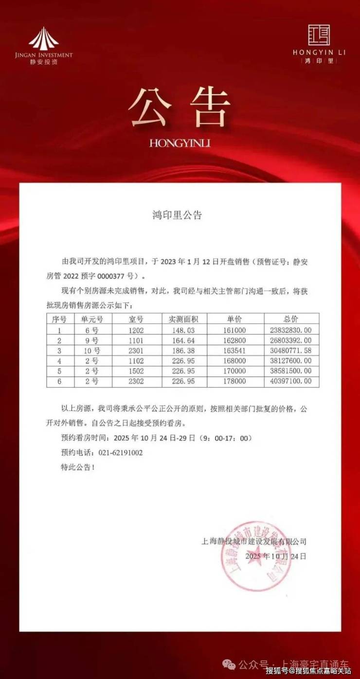 突发:老静安鸿印里公示目前还有6套现房取证销售,且全部都是中高楼层优质房源!