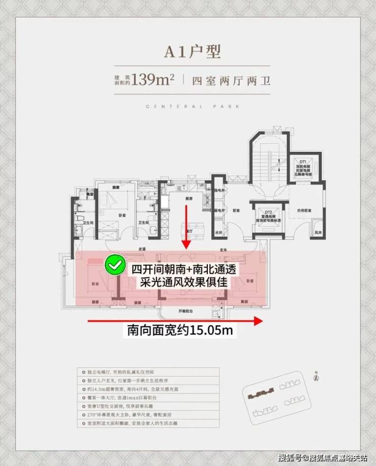 建面约139㎡的户型(西边套),独立电梯厅+罕见的大横厅设计,大面宽短进深,约15.05m的南向奢阔面宽,无论是采光感、尺度性都拉到了极致,享受城央豪宅级别的采光。