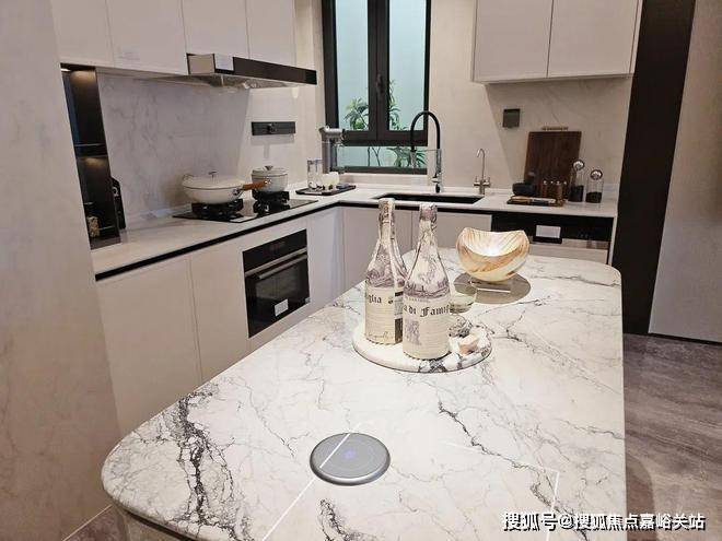 进门可以看到经典的S墙设计,L型厨房操作台面,也是暗藏不少细节——玻璃移门采用完美系列夹丝玻璃+金属造型边框,顶部配置线性凉霸+LED嵌入式回形灯带+筒灯,灶台后侧采用大面积岩板铺设,☑️☑️海上清和玺售楼处电话:400 - 8377 - 020☑️☑️方便清洁的同时显得厨房更加大气。