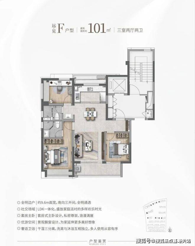 H户型:瞰·见 建筑面积约101㎡,三房两厅两卫华发海上都荟售楼处电话☎:400-833-6309【已认证】售楼处电话☎:400-833-6309【已认证】