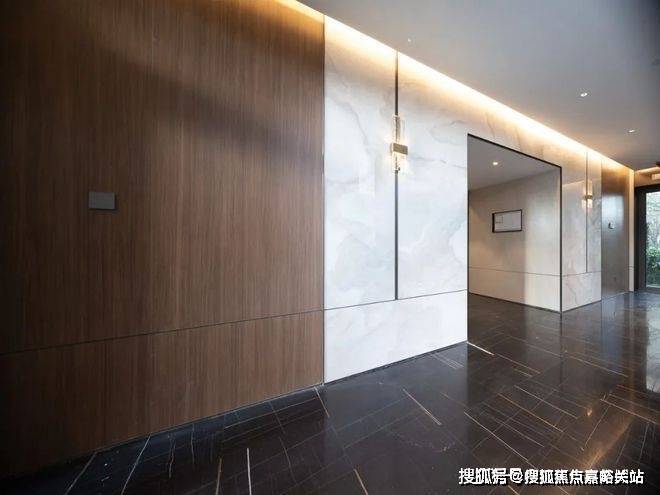 当然这样的艺术格调也从室内延伸至了公区:影木与大理石的结合,加上劳伦黑金大理石铺地,尽显尊贵。